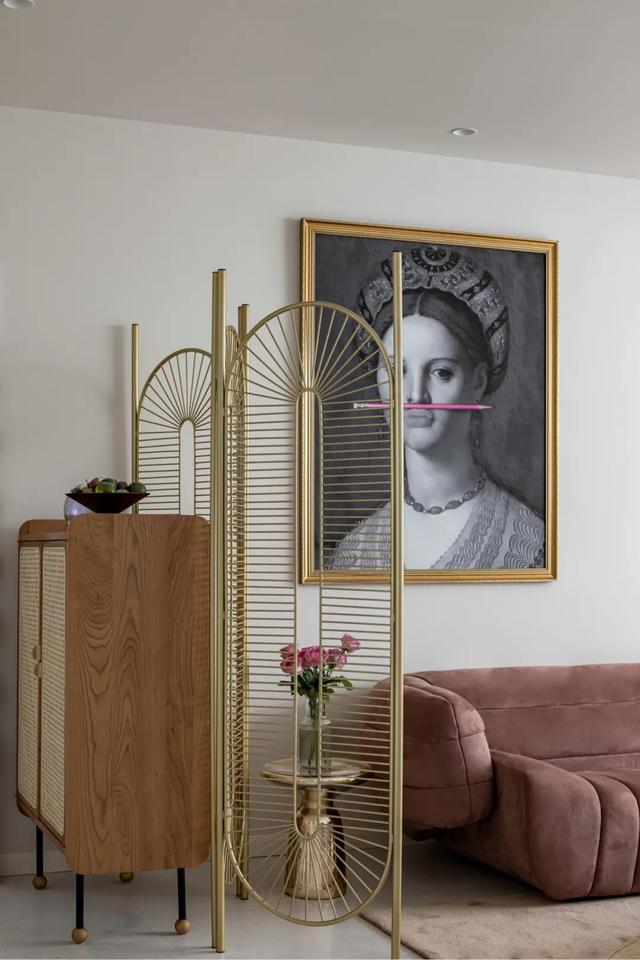 屏风前是一个复旧风鞋柜,高脚安排+藤编柜门,质感实足。