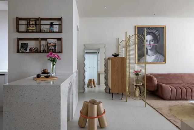 灶间是半盛开安排,进口的右手边定制了酒吧台,从视觉上保证了灶间的独力性。灶间酒吧台沿用了大理石材料质量,外表减少了内凹多层拱形化妆,搭配木墩矮凳,产生了一个袖珍的换鞋区。