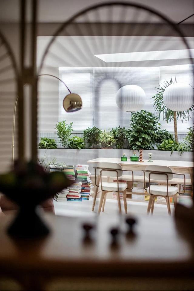 从屏风向屋内望去,朦胧看来平台上的餐厅,被参差不齐的绿植所掩盖住了,在天然光影的映衬下,表露出别样的优美。