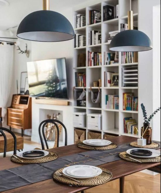 从沙发处往右看是餐厅空间,依旧是浅白色背景+暗色餐桌的对比,空间配色层次明朗也不单调~
