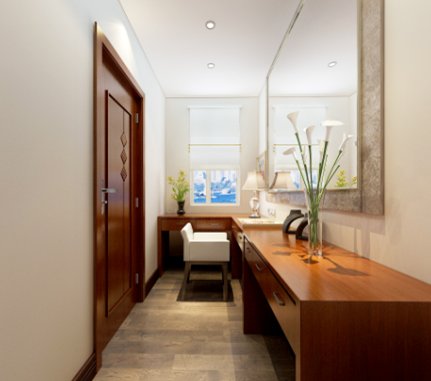 化妆间:空间较小,设计师在设计上是下了很大的功夫,化妆间切忌设计太繁琐,摆放物品不宜过多,与房间的整体装修风格保持一致。