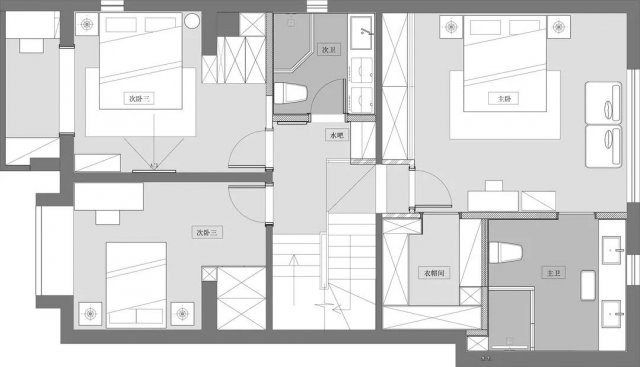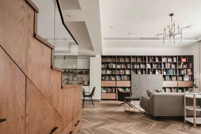 书柜左右两边的门分别通往主卫和衣帽间,每扇门后都别有洞天,每个空间都彼此独立而互相呼应。