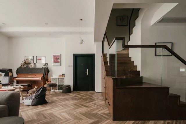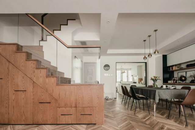 本案并未设计玄关,入户即是一整片的宽敞通透。设计师利用楼梯下方的空间打造了一整面的储物柜,一家人常用的鞋子和雨具都可以收纳其中,木质的柜门和楼梯材质浑然一体,好看又实用。