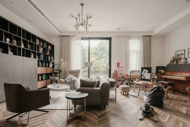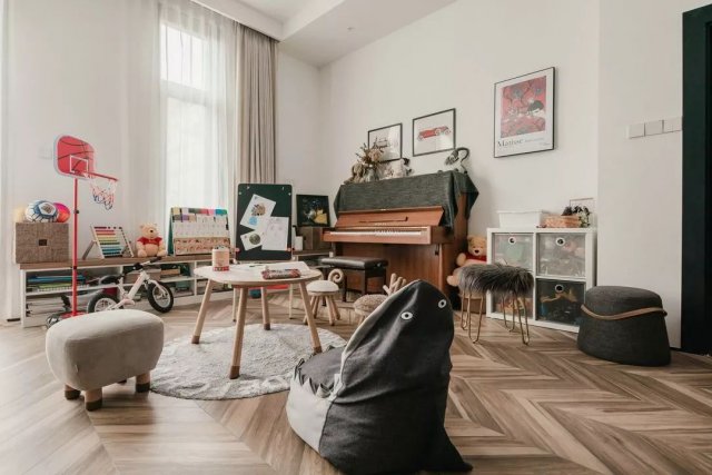 一楼客厅的一半空间都是属于小王子的儿童活动区域,屋主心爱的雅马哈钢琴旁就是小王子的维尼熊和小黑板,黑板上小王子的画作充满童趣。