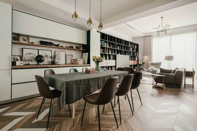 北欧风的餐桌椅组合,黄铜餐厅吊灯,继续延续着客厅配色的简洁和温暖,黑白原木三色的餐边柜则修饰了整个空间大量的白造成的单调。