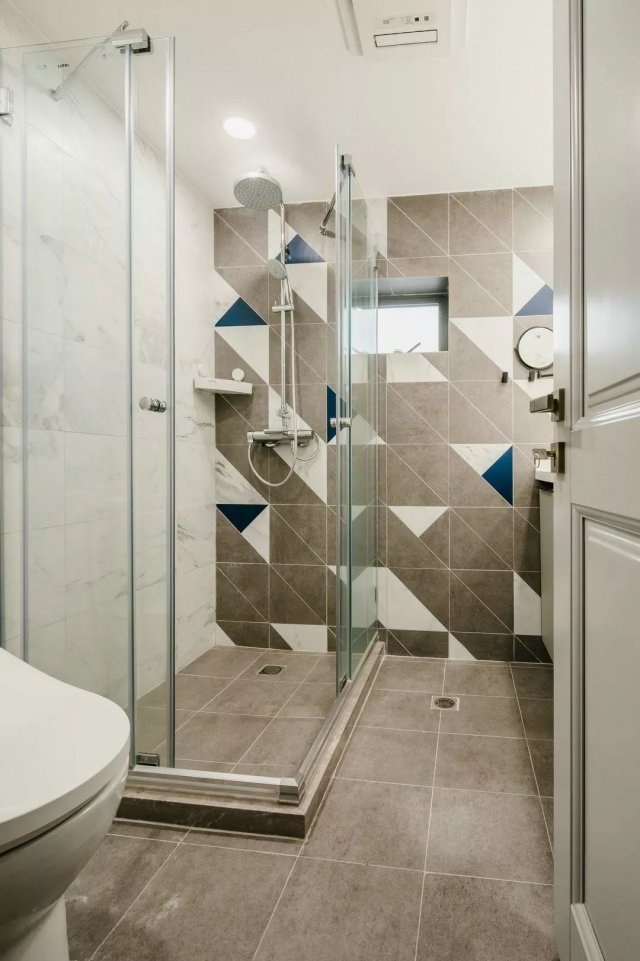 淋浴区和抽水马桶的墙面则使用简单的白色瓷砖,方便清洁。