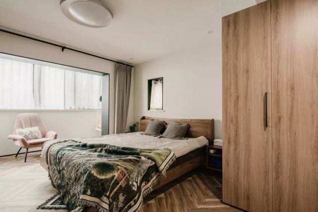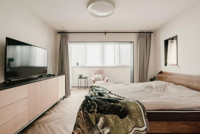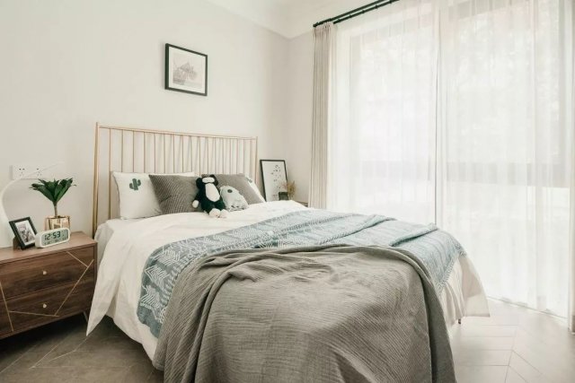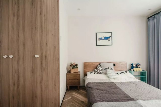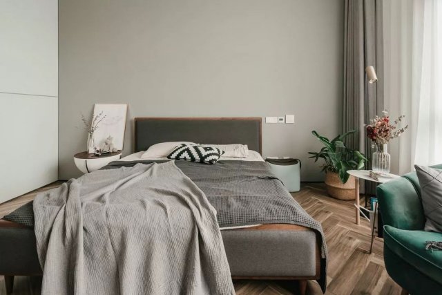 人字拼接的仿木地砖,浅灰色背景墙,为主卧定下基调,深灰+实木的北欧风双人大床和同色系的床上用品都给人静懿、安眠的舒适感。