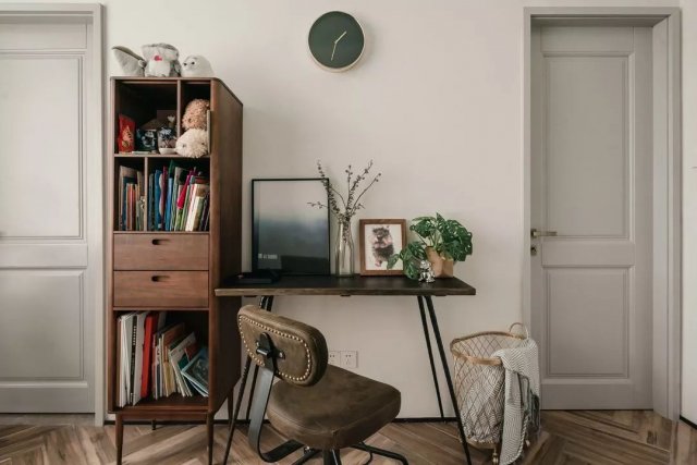 床边靠内墙的一侧是白色大衣柜,床的对面则是一套黑胡桃红橡木书柜和简约欧风的桌椅组。屋主心爱的雪纳瑞寿终正寝后屋主为它举办了葬礼,并将它的骨灰收敛后和它心爱的玩具一起珍藏在书柜上层,可以说真的是非常珍爱了。
