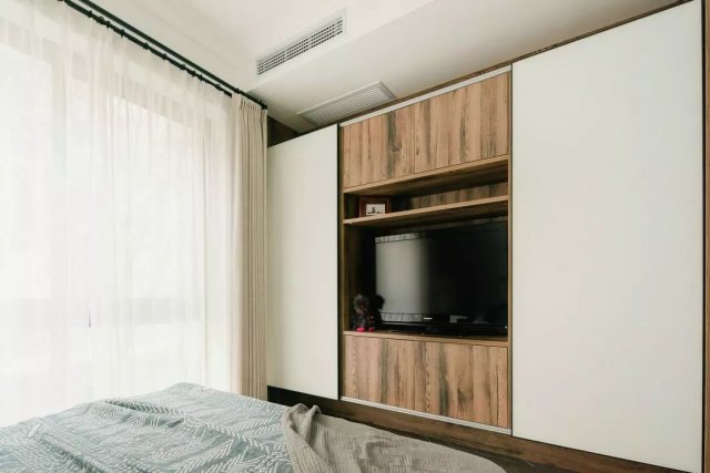 实木大床质朴又有品质,床对面的电视机柜组收纳空间充足。