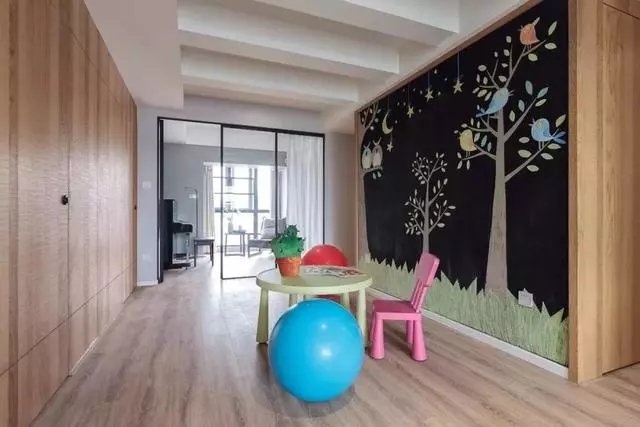 木色清香的过道,用作儿童玩区,黑色背景墙上的卡通彩绘,给简单的过道增添了一笔灵动的色彩。