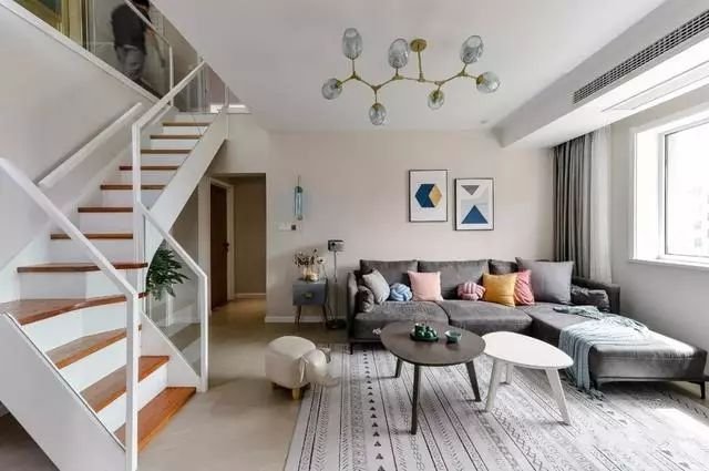 原本楼梯口已经开好,在客厅区域做楼梯,采用灰色转角沙发搭配造型圆润有趣的茶几与矮凳。