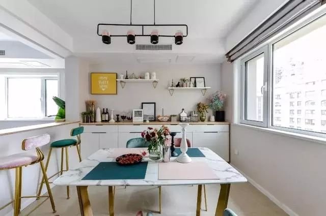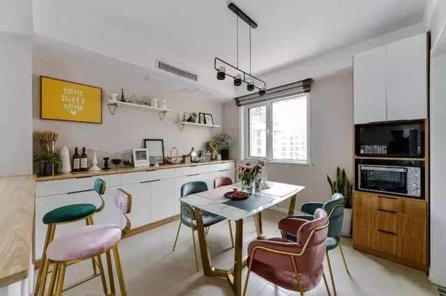 餐厅,采用石材与金属丝绒的餐桌椅,整体呈现INS风的高颜值格调。