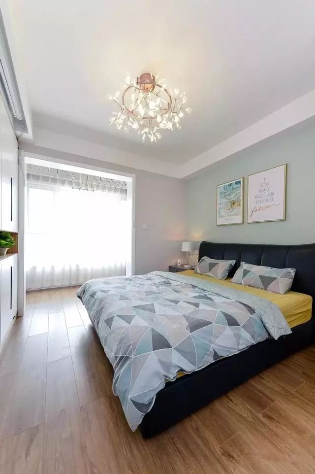 主卧地面铺设木地板,配浅色背景墙,用金边装饰画与玫瑰金北欧风吊灯装饰房间,大大提升了卧室的颜值。