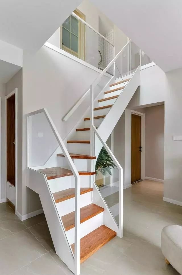 这是通往阁楼的楼梯,白色楼梯主结构配木面踏步与玻璃护栏,确保安全的基础上不影响空间的通透性。