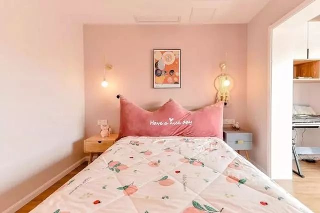 阁楼一处是公主房,用粉色基调配暖光灯饰,可爱又温馨。