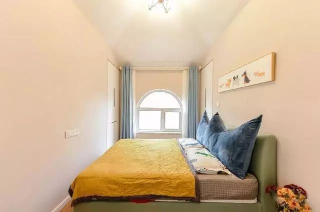另一处是男孩的房间,色调柔和布局简洁,柜体同样采用嵌入式,搭配不规则顶面与圆弧开窗,空间充满童趣。